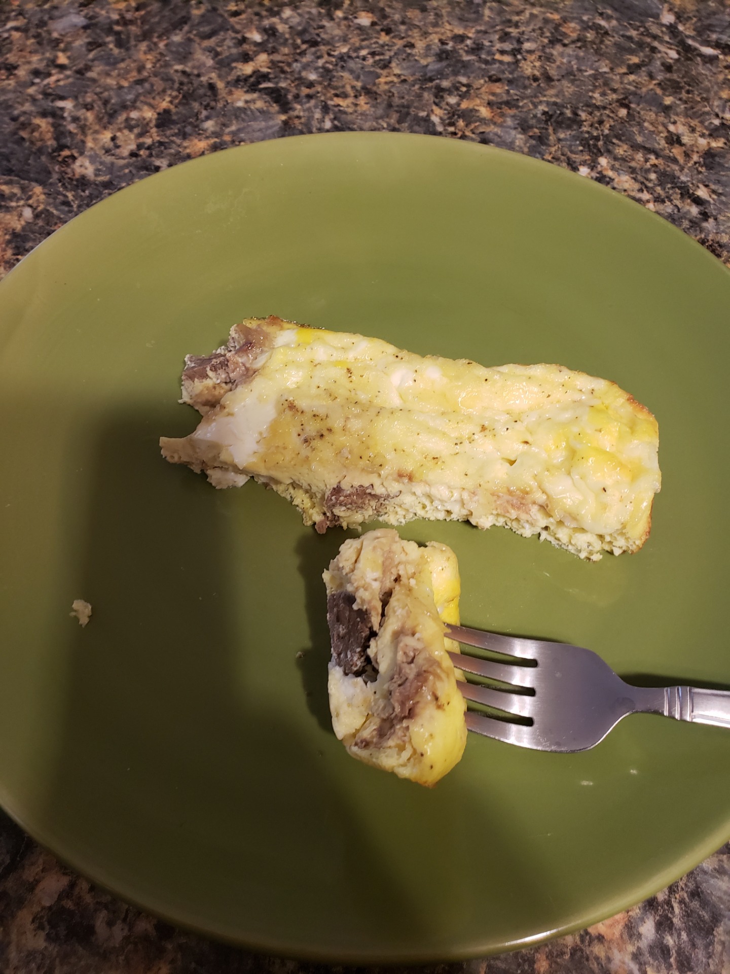 I got a very yummy breakfast idea for you guys. It's a steak, egg, and cheese casserole. The steak and eggs and even cheese are a good source of protein. I get pretty lean steak. Basically to make it you whisk some eggs together then add some salt and pepper and then the steak and cheese. I cut up the steak into pieces. You guys should give this a try, it's delicious! It is also high in protein!
